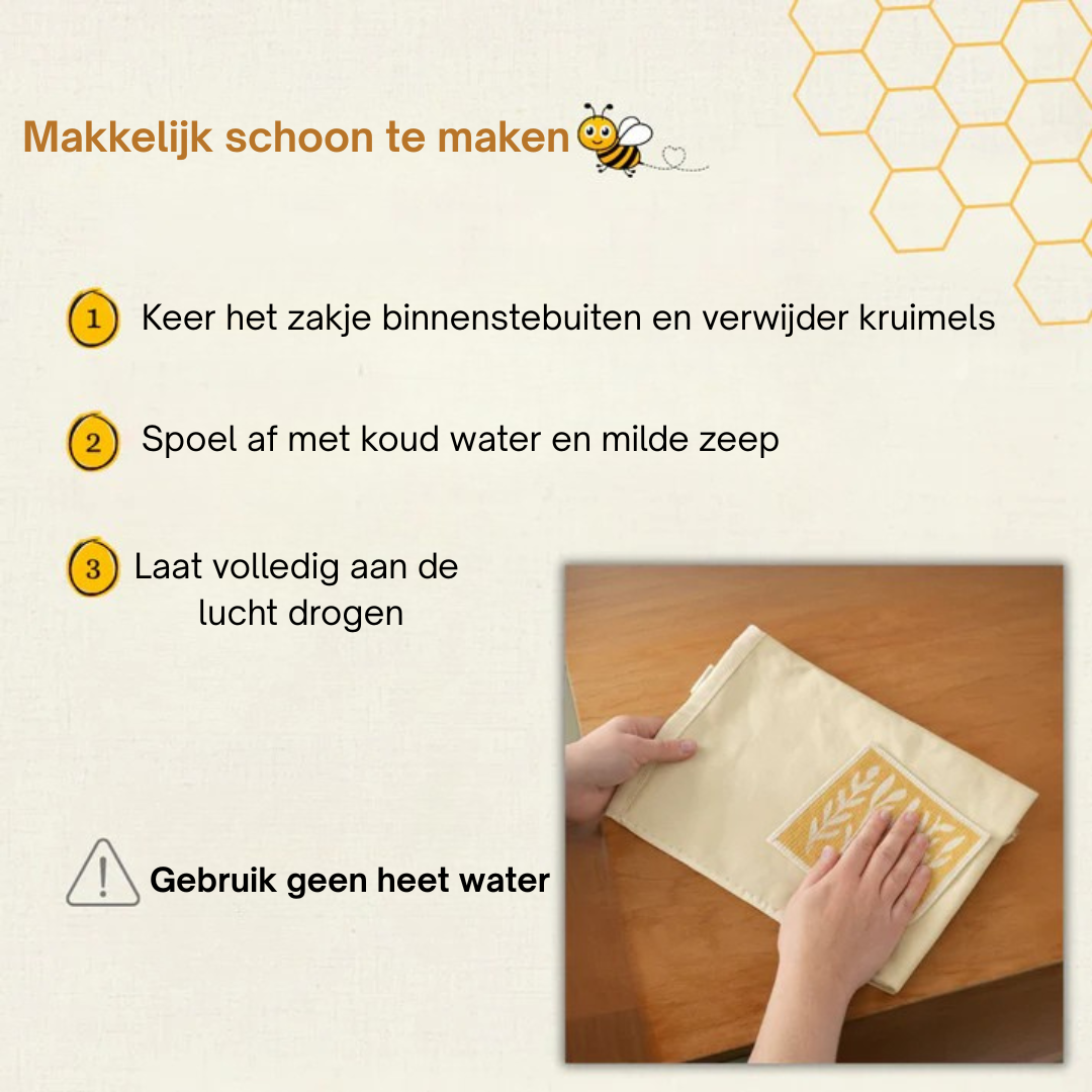 Neem ze eenvoudig af met een vochtige doek of spoel ze uit met koud water en een milde zeep, en laat ze daarna aan de lucht drogen. Vermijd heet water en de wasmachine om de bijenwaslaag te beschermen.