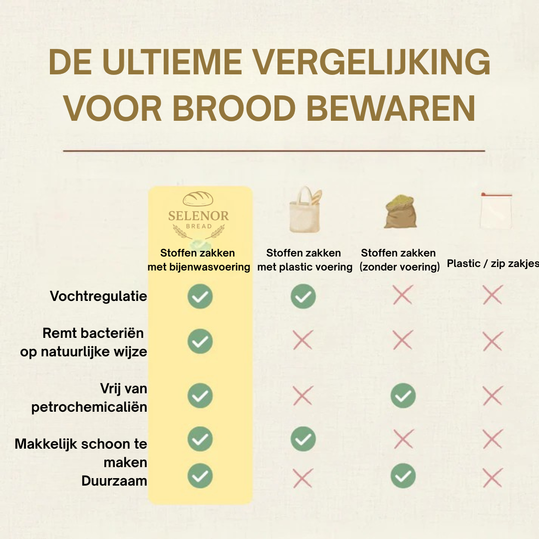 Onze natuurlijke bijenwas creëert een ademende beschermlaag die vocht en luchtcirculatie in balans houdt — in tegenstelling tot plastic, dat condens vasthoudt en brood zompig maakt. Deze natuurlijke laag helpt broden knapperig te blijven aan de buitenkant en zacht vanbinnen, waardoor zuurdesembrood, baguettes en zelfgebakken brood veel langer vers blijven.
